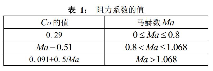 通過(guò)查閱相關(guān)參數(shù)數(shù)據(jù)得到衛(wèi)星質(zhì)量m=13200kg, 并假設(shè)衛(wèi)星受阻面積為16m2, 對(duì)地軌道速度為7800 m/s, 即Ma= 22.9. 從表 1中我們可以得到相應(yīng)的CD=0.11283. 從ρ(h)函數(shù)關(guān)系可以解出如下表所示的在一些特定高度的大氣密度估計(jì)值.