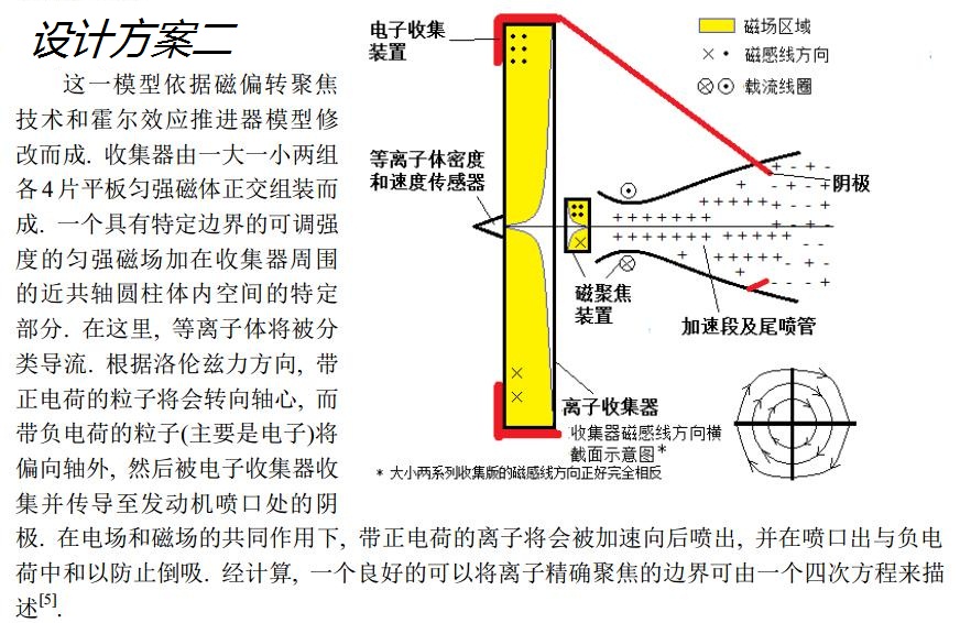 這一事實(shí)讓我想起了使用的離子推進(jìn)器的衛(wèi)星, 如SMART和DAWN衛(wèi)星等. 離子推進(jìn)器的廣泛應(yīng)用說(shuō)明了人類在短距離小空間內(nèi)加速離子的技術(shù)日臻成熟. 這也同時(shí)讓我考慮到一個(gè)新的模型——融合傳統(tǒng)離子推進(jìn)器和沖壓發(fā)動(dòng)機(jī)的設(shè)計(jì), 讓等離子體代替空氣進(jìn)入進(jìn)氣道, 然后使用電場(chǎng)和磁場(chǎng)來(lái)加速, 以取代化學(xué)燃料的燃燒. 這就是我的想法的概述.