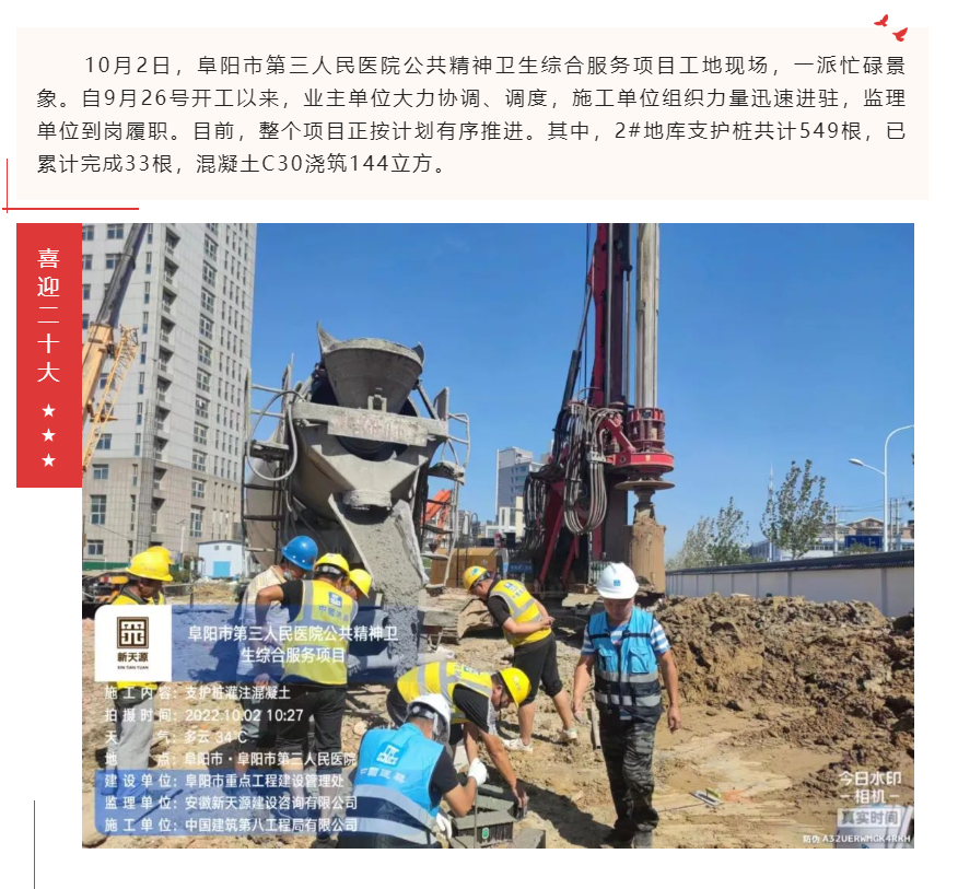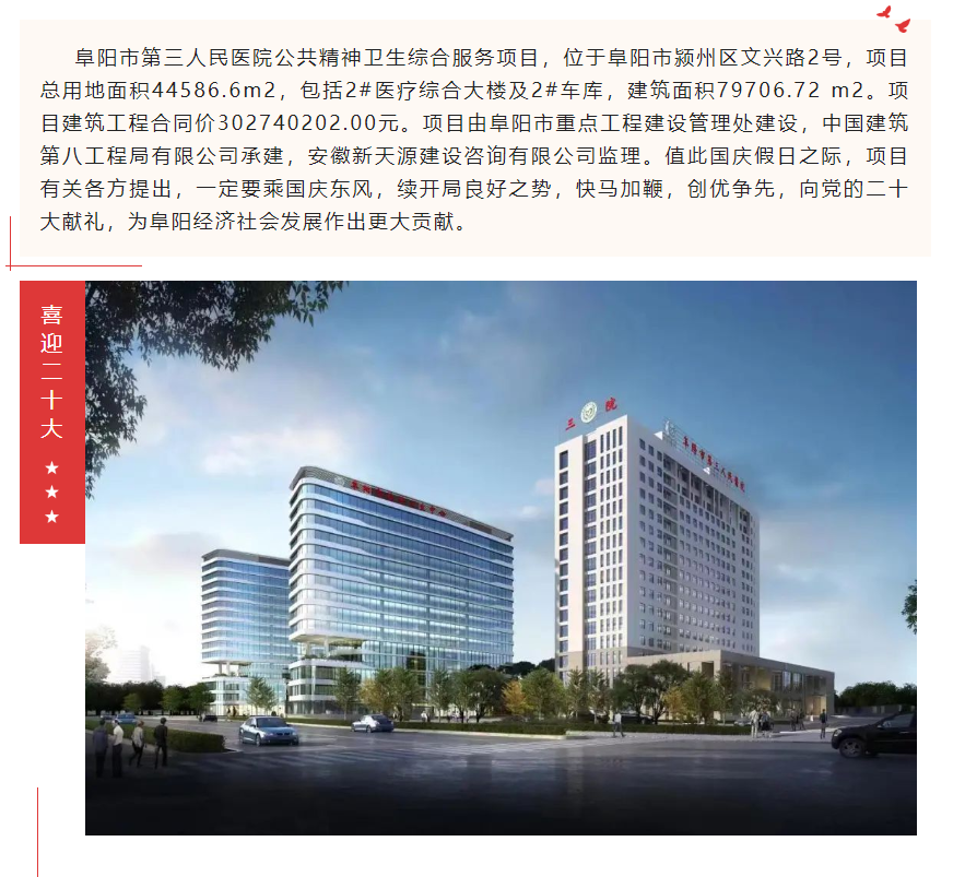 全力開新局 獻(xiàn)禮二十大 ——阜陽(yáng)市第三人民醫(yī)院公共精神衛(wèi)生綜合服務(wù)項(xiàng)目巡禮 作者: 安徽新天源建設(shè)咨詢有限公司 最后修訂: 2022-10-03 16:43:01 摘要: