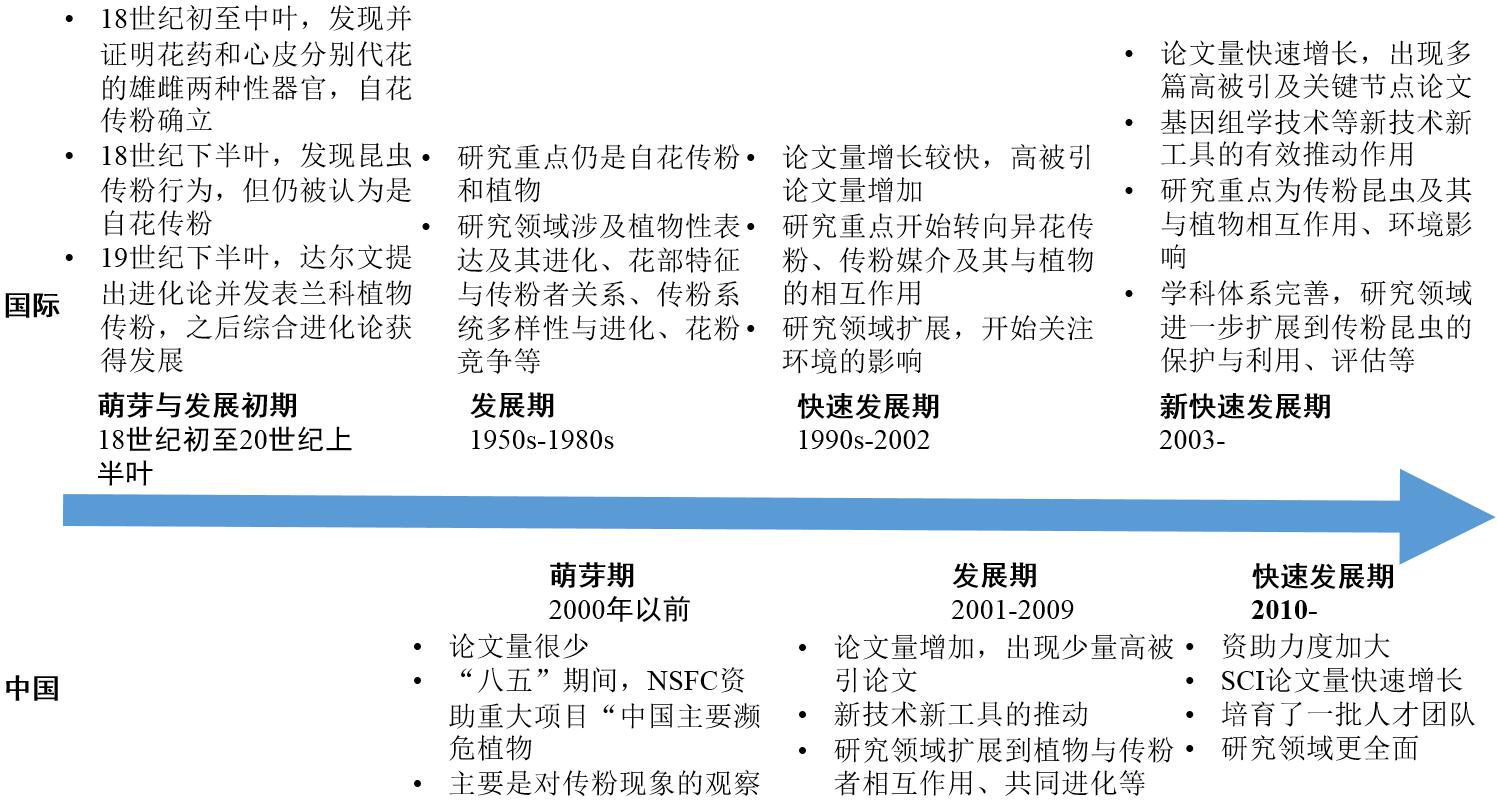 我國(guó)傳粉昆蟲(chóng)研究員起步較晚,主要包括:1)萌芽期(2000年前);2)發(fā)展期(2001-2009年);3)快速發(fā)展期(2010年以后)。我國(guó)傳粉生物學(xué)領(lǐng)域的發(fā)展歷程如圖5所示,國(guó)內(nèi)外的發(fā)展歷程比較如圖6所示。