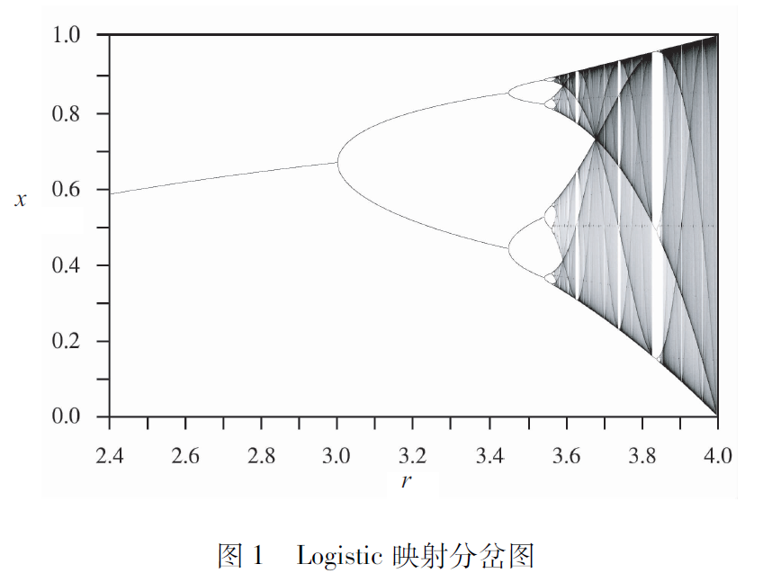 首先給大家介紹一下非線性動力學(xué)的基本概念。考慮到在座的大多是等離子體方面的專家,對非線性動力學(xué)不太熟悉,因此我就從最簡單的離散映射系統(tǒng)開始為大家進(jìn)行介紹。這個映射系統(tǒng)雖然看起來非常簡單,但足以讓大家比較好地理解非線性動力學(xué)的基本概念。Logistic映射數(shù)學(xué)表達(dá)式是xn+1=rxn(1-xn),它是非線性動力學(xué)里非常基礎(chǔ)的一個例子。盡管Logistic映射看起來很簡單,但它已經(jīng)是一個動力學(xué)系統(tǒng),即它的狀態(tài)變量是隨時(shí)間演化的。對于我們現(xiàn)在討論的Logistic映射,比如說第n步是xn,那第n+1步是什么呢?很簡單,由映射關(guān)系就可以得到xn+1。我們來觀察它隨時(shí)間會如何演化,比如說從x0開始,迭代第一步得到x1,再得到x2,一直迭代下去我們最終可以觀察到映射的穩(wěn)態(tài)結(jié)果,那我們究竟可以觀察到什么樣的穩(wěn)態(tài)行為呢?這其實(shí)就是非線性動力學(xué)研究的一個主要內(nèi)容。我們來看這么一個簡單的Logistic映射,圖1給出了它的分岔圖。顯然,映射最終的穩(wěn)態(tài)行為是與映射的參數(shù)有關(guān)系的,通過圖1的分岔圖我們就可以觀察映射在各個參數(shù)下的穩(wěn)態(tài)行為。