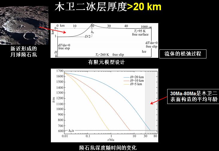 冰層厚度很重要:厚的冰層可能發(fā)生對流,有利于表面與水的連通;過薄的冰層不利于對流的發(fā)生,限制了表面與水的連通。動力學數(shù)值模擬揭示:木衛(wèi)二冰層厚度大于20km。